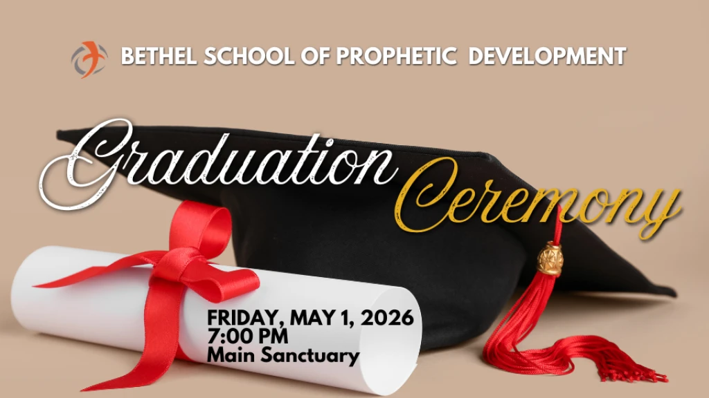 Bishop Eric A. Lambert, Jr., and the staff and students of the Bethel School of Prophetic Development, proudly invite you to join the annual commencement exercise for the graduating class of 2026. The ceremony will take place on Friday, May 1st, 7:00 pm, in the Main Sanctuary. Let's congratulate the students who have finished this part of their journey and help them glorify the Lord for all He has enabled them to accomplish.